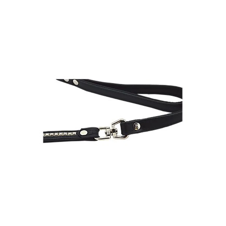 Laisse en chaîne et cuir décoré avec des petites plaques métalliques, de très belle finition, élégante et très solide.