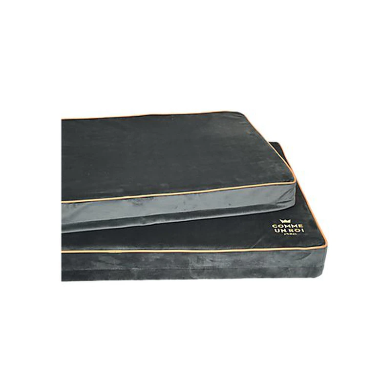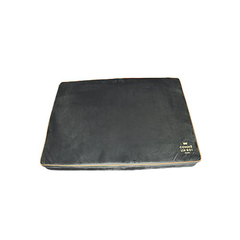 Matelas super confortable grâce à un rembourrage de mousse polyester de haute densité et épaisse, déhoussable et lavable. Le matelas So chic Comme Un Roi est en velours coton/polyester brun anthracite avec des liserés fauve, et une broderie dorée » Comme un Roi » en angle.