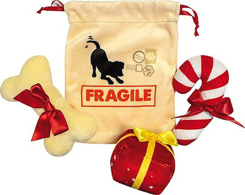 Colis de Noël avec 3 jeux en peluche (os, sucre d’orge et un petit cadeau). Les jeux sont sonores pour attirer le chien.