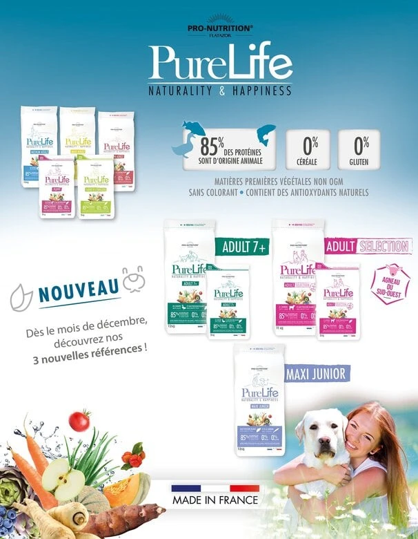 Parce que vos chiens et vos chiens mĂ©ritent de manger ce qui leur convient le mieux, les aliments Pure Life de Pro-Nutrition sont parfaitement adaptĂ©s Ă leur vĂ©ritable nature avec 85% de protĂ©ines d’origine animale, pour garantir leur Ă©panouissement au quotidien. Chaque aliment est formulĂ© sans cĂ©rĂ©ale et sans gluten, pour une parfaite digestibilitĂ©, et intègre un noyau de fruits et lĂ©gumes permettant d’obtenir une richesse en diffĂ©rents nutriments pour un Ă©quilibre nutritionnel optimal et favoriser ainsi leur bien-ĂŞtre.