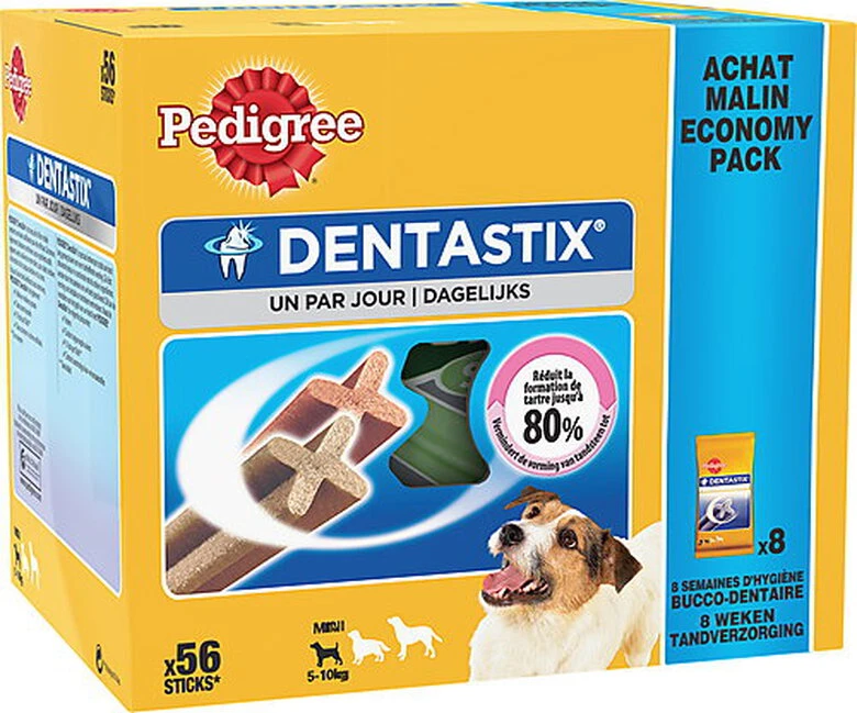 En utilisation quotidienne, ces bâtonnets en forme de X aident à réduire jusqu’à 80% la formation de tartre, grâce à leur texture spéciale et aux ingrédients actifs.Pedigree Dentastix est également faible en matières grasses, sans sucres ajoutés, sans colorant ni arôme artificiels.
