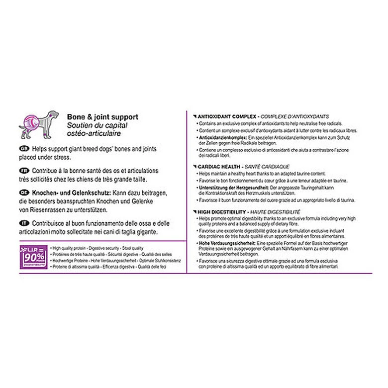 CONSTRUCTION DU CAPITAL OSTÉO-ARTICULAIRE : Contribue à la bonne minéralisation des os du chiot de très grande taille grâce à un apport énergétique et minéral (calcium et phosphore) équilibré, assurant ainsi la consolidation de l’ossature et aidant à protéger les articulations.