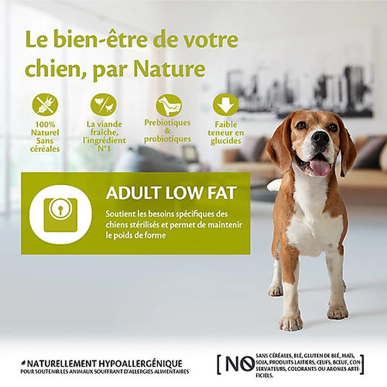 Cet aliment est pauvre en allergènes : il ne contient pas de céréales, de gluten de blé, de maïs, de soja, de produits laitiers, d’½ufs et de b½uf.