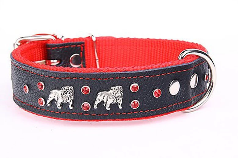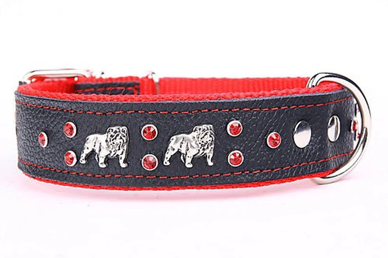 Collier avec ornement de bulldog anglais en cuir véritable sur le dessus et sangle en polypropylène de haute qualité sur le dessous. Anneau en D solide et soudé.