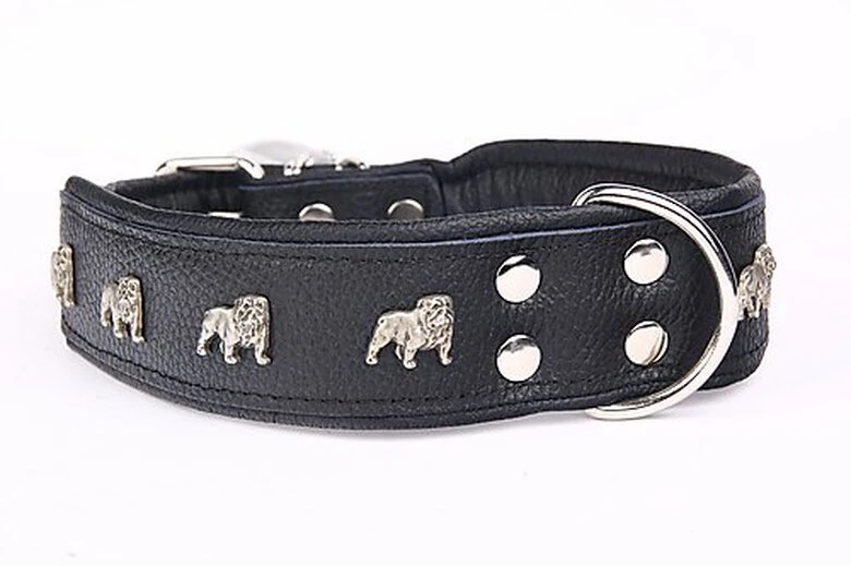 Collier avec ornement de bulldog anglais en cuir véritable sur le dessus et cuir nappa véritable de haute qualité sur le dessous. Anneau en D solide et soudé.